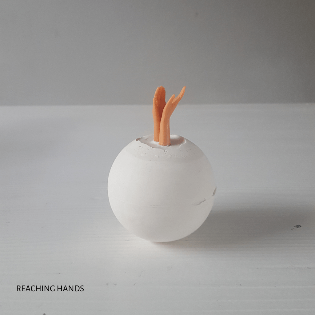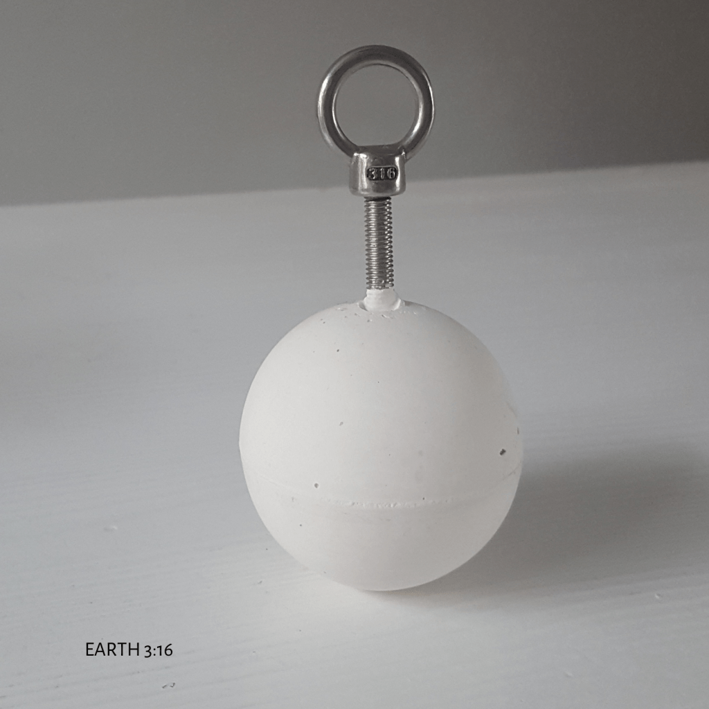 Deze ballen zijn een samensmelting van onze werkelijkheid die schuurt, eenzaam is, zwaar en vol van onrecht. En de werkelijkheid die vol is van schoonheid, vreugde. licht en verbinding. De witte puurheid van de bal staat tegenover het gewicht in je handen, de vorm die met de bal verbonden is kil en sierlijk tegelijk.