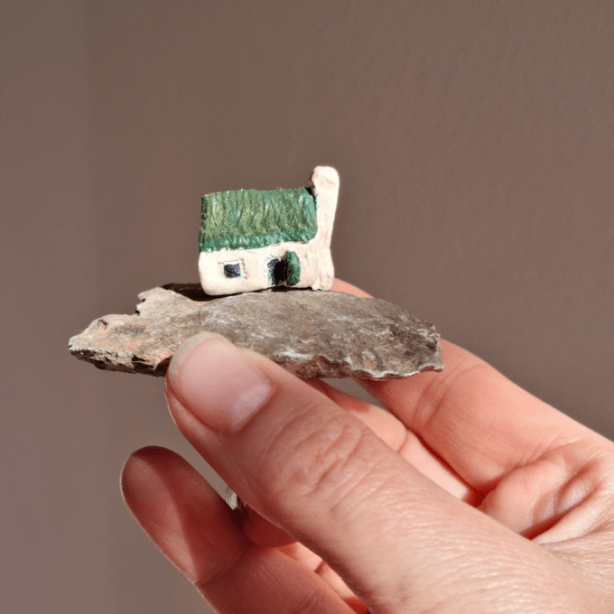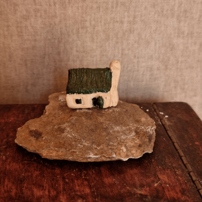 Een (T)huisje op het fundament. De (T)huisjes die ik maak zijn een uiting van mijn verlangen dat iedereen een thuis vindt. Ze zijn handgemaakt van eenvoudige klei en met aandacht voor het maakproces.