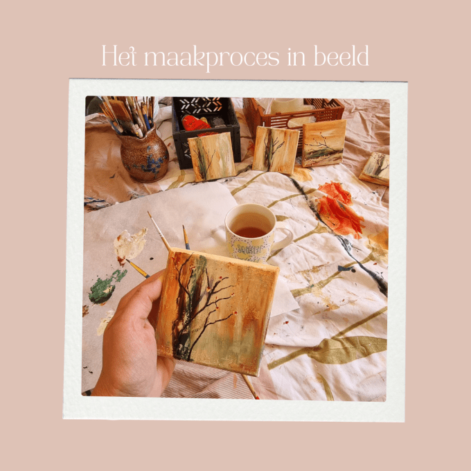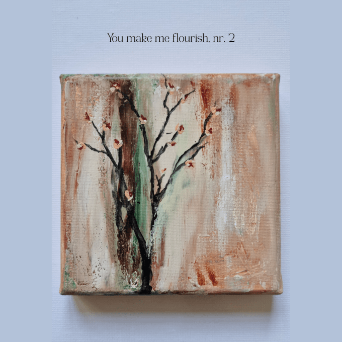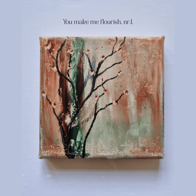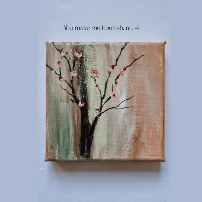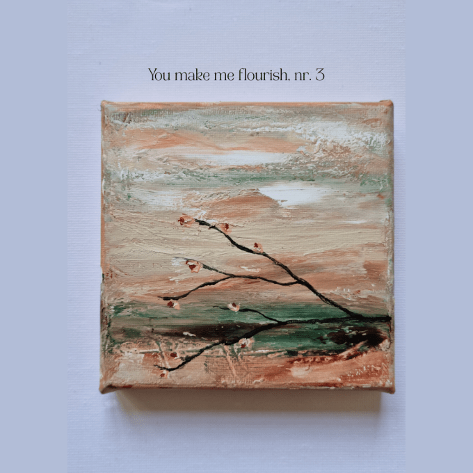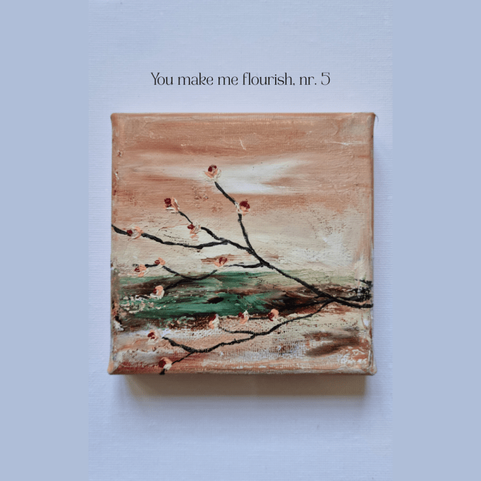 You make me flourish. Een vrouwelijke, zachte serie van mini-schilderijtjes met een waarderende titel. Heel geschikt om cadeau te geven aan jezelf of als waardering aan iemand die heeft bijgedragen aan jouw bloei en groei. Details: 10×10 cm, Acryl op linnen, mat vernis.