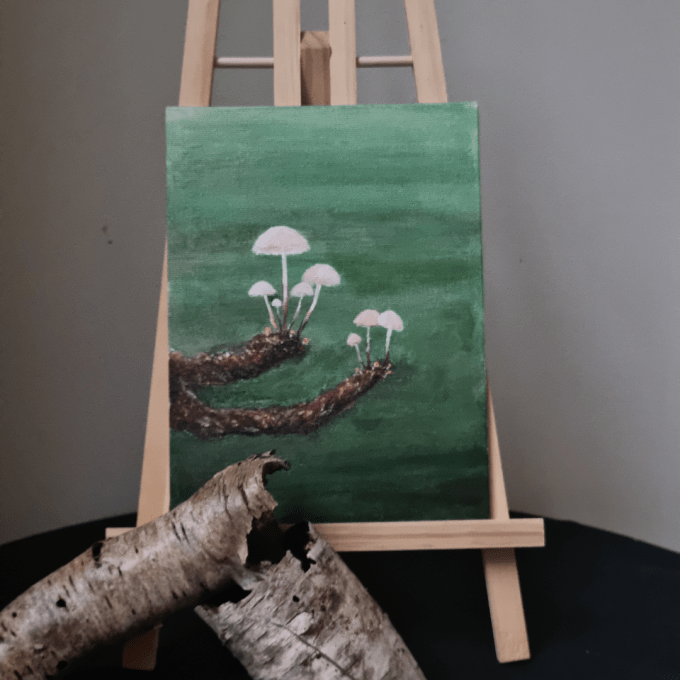 Het dode hout geeft voeding aan het nieuwe leven dat groeit. Er is vergankelijkheid en er is nieuw leven. Samen vormen ze een prachtig symbool voor de kringloop en de seizoenen van ons leven. Details: Acryl op canvaspaneel met zijdeglans vernis, 18 x 24 cm.