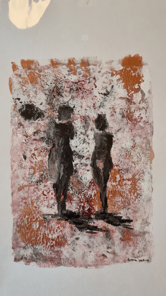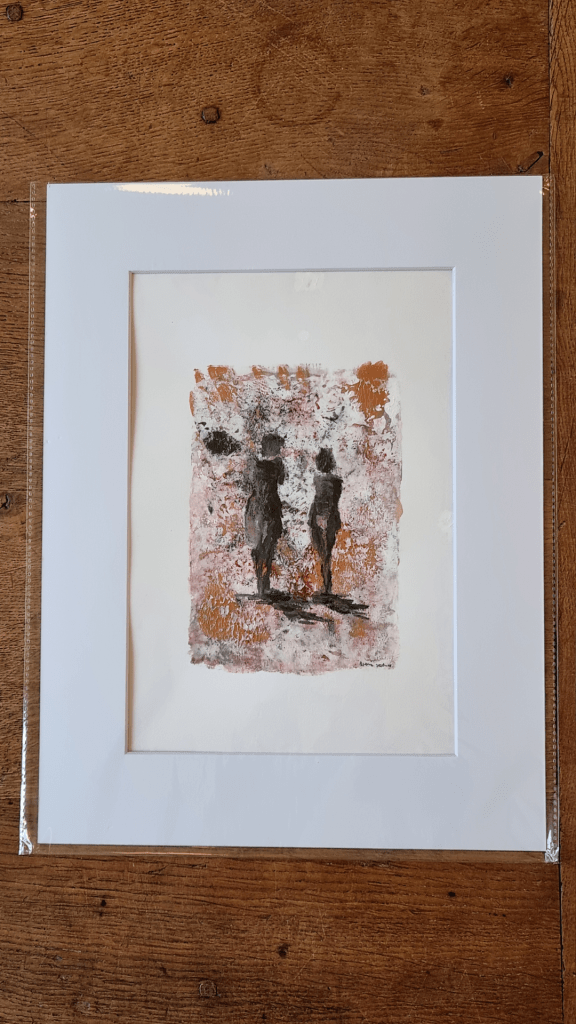 Een uitdrukking van samen reizen en in gesprek zijn. Acryl op aquarelpapier, gemaakt met een gelli printplate. Afmetingen incl. passepartout 30 bij 40. Geleverd zoals op de foto.